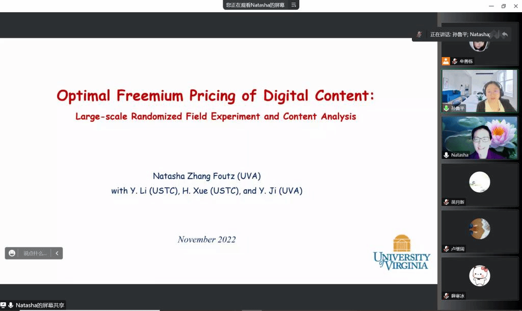 At 9:45 a.m., November 30, 2022, the Business School of Central University of Finance and Economics (CUFE) held the 22nd Session of the Excellent Academic Forum Lecture Series in 2022 and the 3rd Session of the Data Science Lecture Series online through Tencent Meeting. Natasha Zhang Foutz, a professor at the McIntire School of Commerce, University of Virginia, was invited as the keynote sp...
