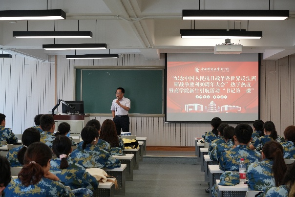 9月3日,纪念中国人民抗日战争暨世界反法西斯战争胜利80周年大会在北京天安门广场隆重举行。437必赢会员中心组织全体2025级本科新生集体观看并开展热学热议活动。437必赢会员中心党委书记李跃新与新生一同热议庆祝大会,为同学们科普二战知识。随后,李书记就家国情怀为主题为同学们讲授“书记第一课”,李书记将家国情怀具象化,深入浅出地讲述了家国情怀在生活中的体现,强调责任与担当对于新时代青年的重要性。