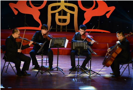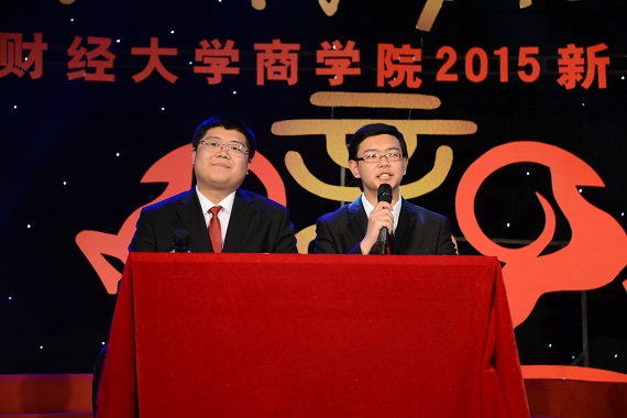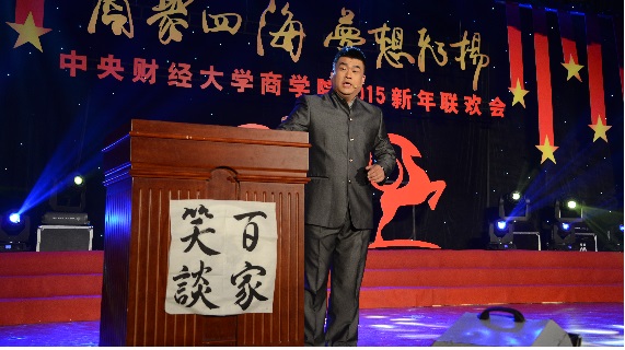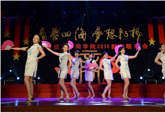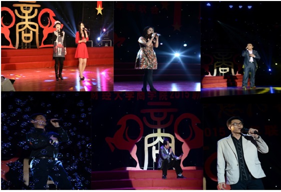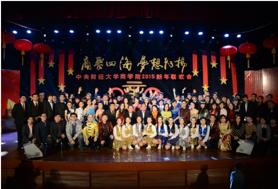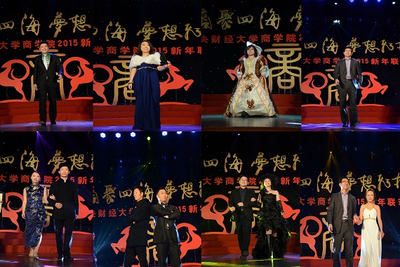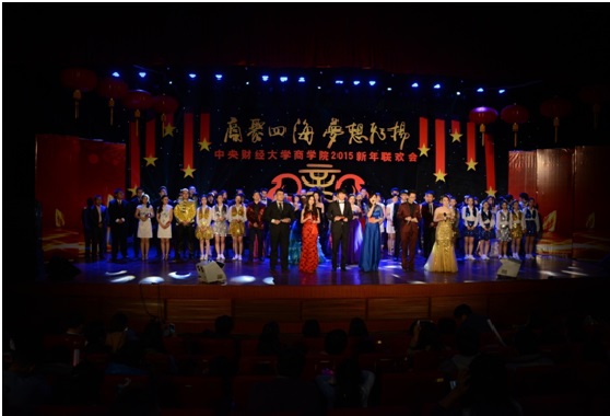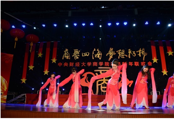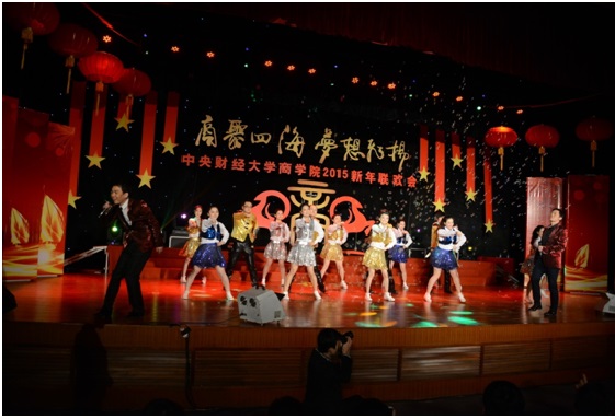 联欢会在MBA学生带来的活力四射、热情洋溢的歌舞《超级英雄》拉开了序幕,热情尚未散去,本科、研究生以及校友、老师轮番上台,用精彩纷呈的歌曲串烧为观众奉上音乐盛宴。诗朗诵《商院人》情深意切,相声《中财新闻联播》诙谐风趣,古典舞蹈《咏春》《桃夭》,惊为天人,美轮美奂;动感T台秀,历届商院校友在动感的乐曲中展现着自信、青春的姿态,为观众送去新年祝福。宛转悠扬的独唱《幸福山歌》、精妙绝伦的弦乐四重奏让观众沉醉其中,校友独唱《改变自己》、《再回首》令人喝彩,回味无穷,爆笑的脱口秀《百家笑谈》、引人入胜的魔术以及舞台剧《中财好声音》更是获得掌声不断、欢笑连连,将现场的气氛推向了高潮。