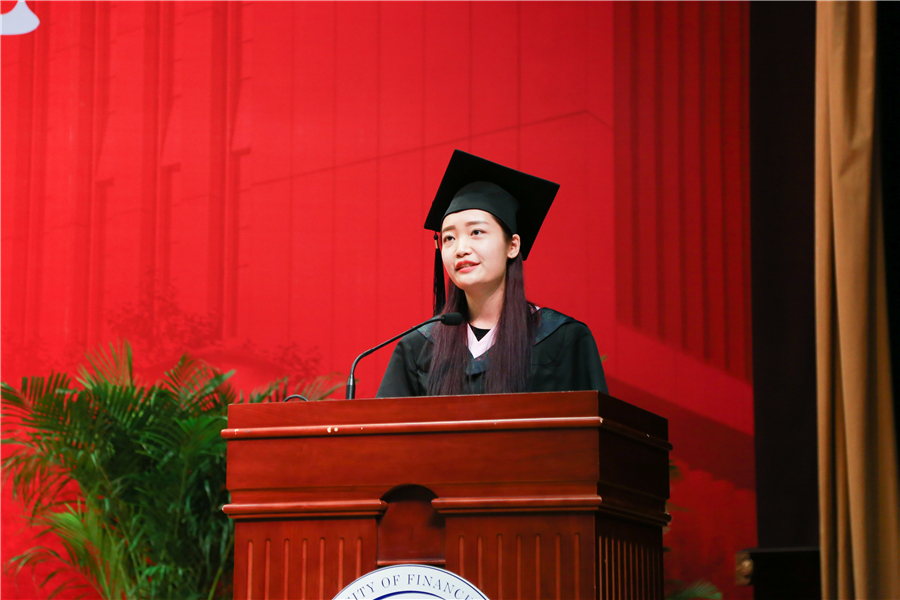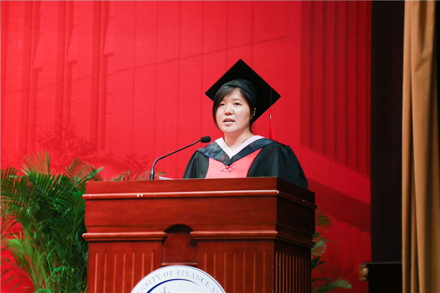 2012级本科生曾戬媛、2014级学术性硕士生蕾拉、2014级MBA硕士生殷丽莉、2013级博士生韩慧林分别作为毕业生代表发表了毕业感言。代表们回顾了难忘的校园生活,衷心感谢老师们付出的心血和汗水,感谢同学们彼此之间的关爱和帮助,感谢亲友们在自己求学之路上的支持!他们表示,作为中财的毕业生,他们一定自觉担负起时代赋予的历史重任和光荣使命,秉承母校“忠诚、团结、求实、创新”的校训,牢记老师们的谆谆教诲,在今后的工作中谱写新的篇章,创造新的辉煌,以骄人的成绩为母校增光添彩,为实现中华民族伟大复兴的中国梦努力奋斗!来自物流管理专业的曾戬媛同学已被美国俄亥俄州州立大学哥伦布分校录取,她的2012级本科同学中还有30位小伙伴也将分赴海外,前往伦敦政治经济学院、纽约大学、新加坡南洋理工大学等国际知名高校深造;而学术型硕士研究生代表蕾拉则是来自非洲马里共和国的留学生,她用流利的中文表达了她对437必赢会员中心、中财437必赢会员中心师生友人们的感谢,要将这份真挚的情谊带回她的祖国!