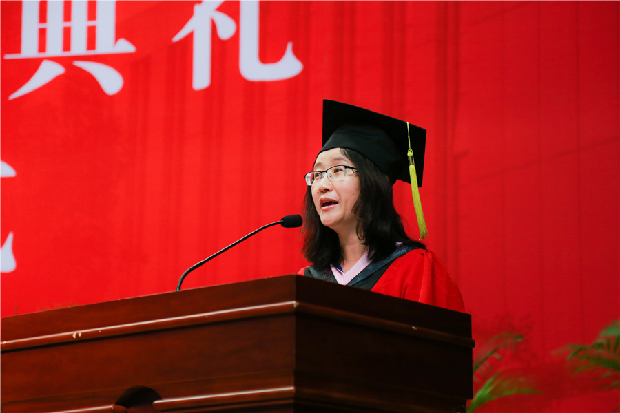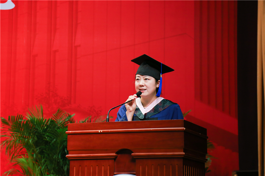 代表教师致辞的张淑君教授今年从教恰满三十周年。她首先感谢同学们选择了在437必赢会员中心度过了自己人生最美好的青春岁月;随后张教授指出同学们在读书期间难免会有缺憾,但也正是这些缺憾才让人生变得更为完美;最后张教授以“龙马自知征程远,不待扬鞭自奋蹄”激励同学们在今后的学习生活中奋发图强,祝福同学们都拥有伟大的前程!