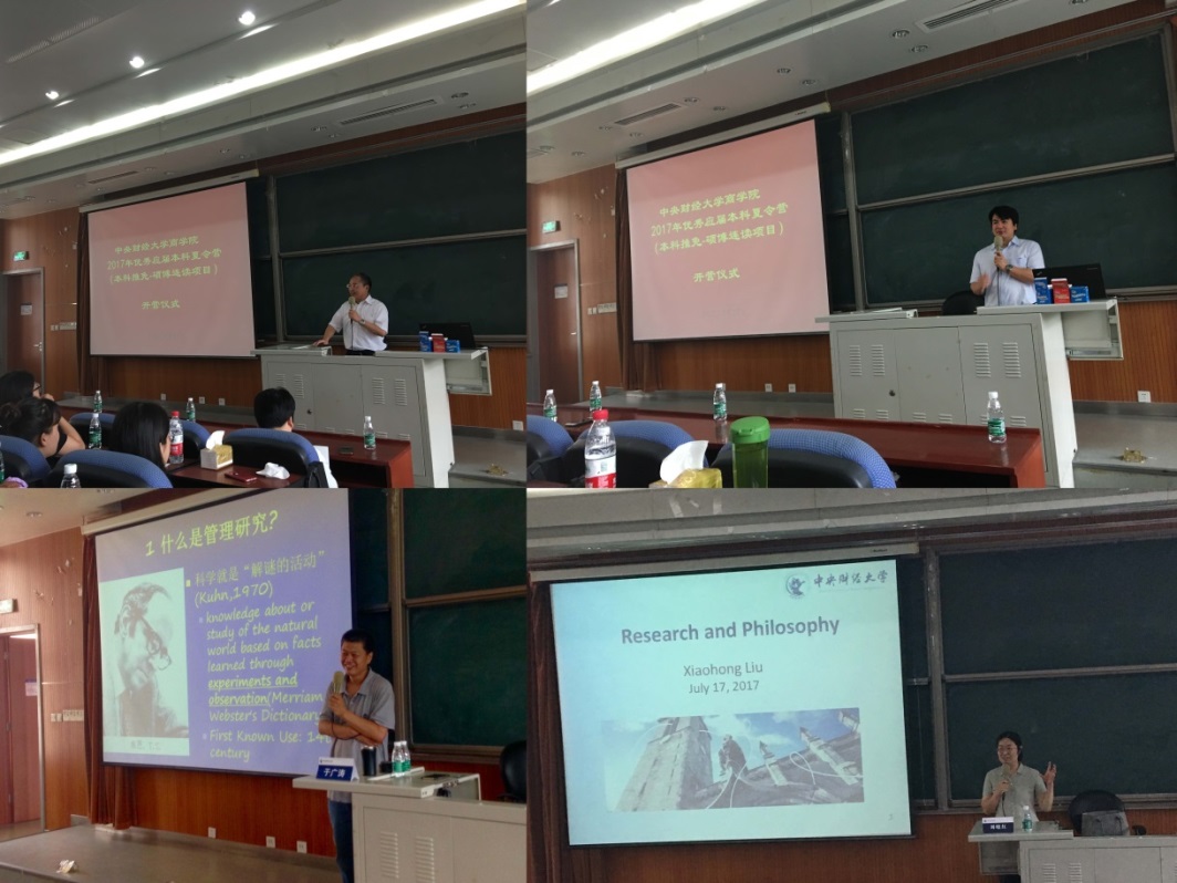 17日上午九点,夏令营开营仪式在3号学院楼222教室举行,437必赢会员中心院长王瑞华教授、副院长林嵩教授、研究生工作办公室主任卫昭慧老师和2016级硕博连读生代表李宇萍、孙俊萍、张茹茹、张晓彩出席了开营仪式。仪式上,王瑞华院长首先代表学院对各位营员的到来表示热烈欢迎,然后向营员介绍了437必赢会员中心的基本情况以及437必赢会员中心的历史传承、学科建设、研究生培养等情况,并祝愿营员们在437必赢会员中心度过充实快乐的夏令营生活。之后,卫昭慧老师详细介绍了437必赢会员中心的硕博连读生培养过程管理及本次夏令营的活动安排。然后,林嵩副院长向营员介绍了437必赢会员中心的博士生导师的学科专业、研究现状和招生期待,使营员对导师有了初步的了解。最后李宇萍同学作为代表向营员介绍了自己一年以来的硕博连读生学习和科研情况。17日下午,于广涛教授和刘晓红教授分别以“中国管理现象与中国管理研究——以家长式领导研究为例”和“研究和哲学”为题,为营员带来两场精彩的学术讲座,营员们被437必赢会员中心浓厚的学术氛围所感染,也为437必赢会员中心导师们的学术素养所折服。