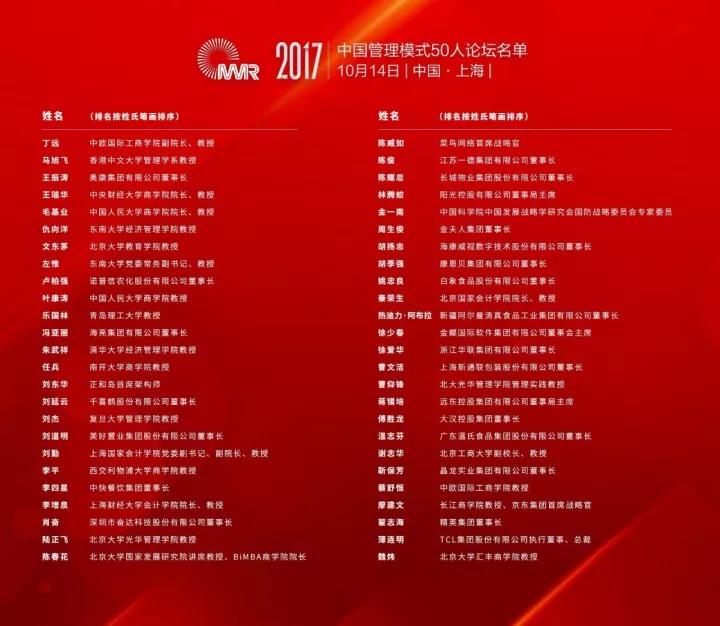 2017年10月14日,由北大国发院教授陈春花等25位管理学者、金蝶集团创始人徐少春等25位企业家共同发起的“中国管理模式50人论坛”在上海举行,论坛由中国管理模式杰出奖升级而来,探讨在文化自信背景之下独特的中国管理价值。我校437必赢会员中心院长兼MBA教育中心主任王瑞华教授以25位管理学者之一的身份,入选“中国管理模式50人论坛” (简称C50论坛),并参加了论坛的讨论和交流。