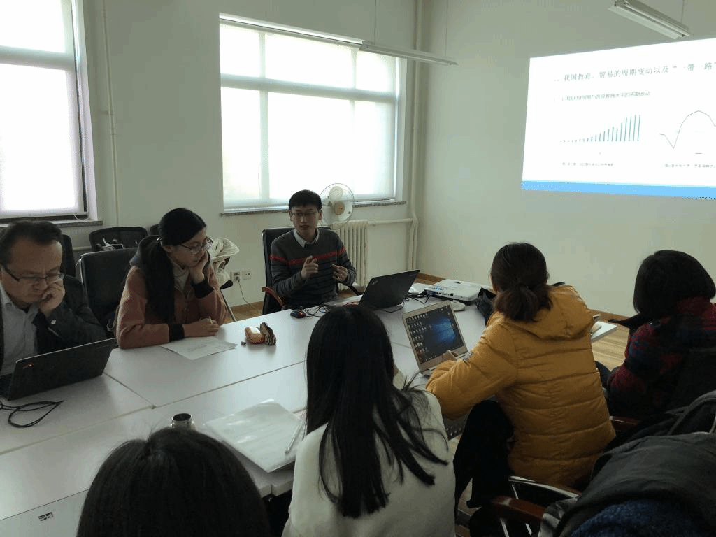来自国际经济与贸易学院的2016级硕博连读生冯阔同学,展示了最近被新兴经济体论坛录用的学术论文《“一带一路”倡议下的贸易冲击与我国人力资本投资--基于DSGE模型的个体素质差异研究》,该论文被评为2017新兴经济体论坛研究生优秀学术论文。冯阔同学从劳动力市场角度出发,深入浅出的解释了整个数理模型框架,并对不足之处进行了分析。中国金融发展研究院的周天航同学从DSGE的校准估计角度提出了进一步的修改建议,现场研讨氛围热烈。