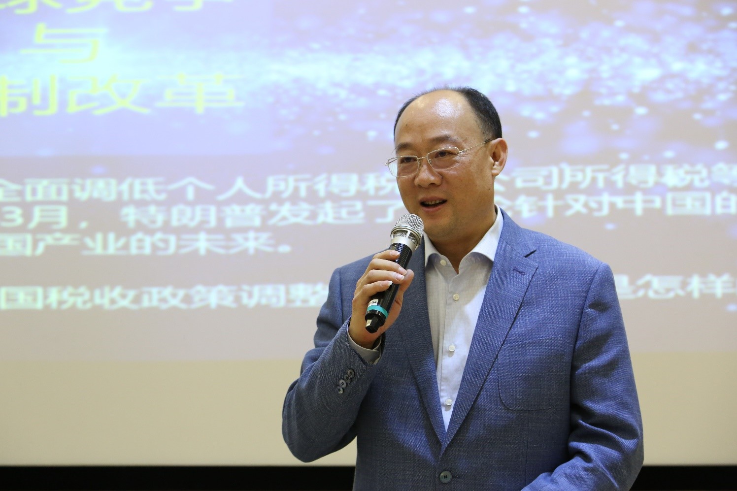 蓝逢辉先生首先表达了自己回到母校的欣喜之情,并对“我国通过税收政策调整与改革,提升中国企业全球竞争力”这一议题进行了补充。“中美由于税制不同,因此改革的方式也不同,特朗普进行税制改革之后,尽管贫穷家庭、中产阶级家庭都可以从美国税制改革中受益,但最受益的还是大企业、财团等。”蓝逢辉先生强调,这一改革对中国税制改革也有相应的促进作用。中国2016年进行了全面的营业税改增值税的税制改革,大企业对这一改革的反应相对于小微企业会更加强烈一些。蓝逢辉先生认为,国地税的合并、“营改增“的全面改革,本质上是为了规范市场秩序,重新建设中国增值税科学征管体系。蓝逢辉先生主张社保费应由税务局代征,税务局直接征收社保费可以减少漏洞,增加社保费收入,但必须降低社保费征收费率,降到企业可以承担的水平。此外,他还提出,小微企业最大的职能不在于经济贡献,而在于解决社会就业问题、维护社会稳定,为社会和民生服务的职能,因此进行税制设置时要”站在老百姓的角度“,多为小微企业生存和发展着想。