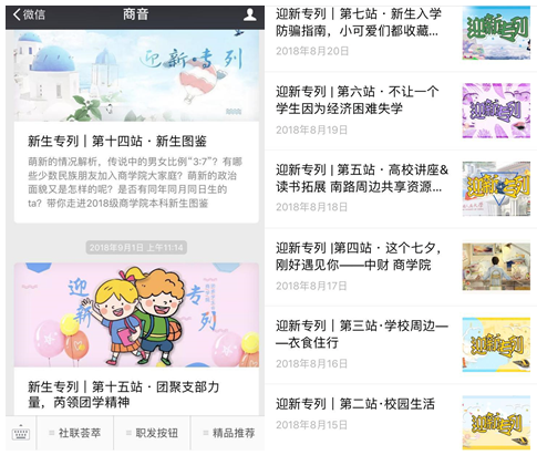 借助“中财437必赢会员中心”、“中财MBA”、“商音”微博微信等新媒体网络载体,437必赢会员中心为新生提供了温馨的咨询服务,开展了以#这个七夕.刚好遇见你#、#以心迎新#、#新生图鉴#等为主题的微迎新,以#商院专列#为特色的微信迎新系列活动,发布了详细周到的报到攻略、新生须知、防骗指南、困难帮扶等信息;MBA创新开展了迎新视频直播活动,充分展现了必赢官网文化迎新、特色迎新的风采。