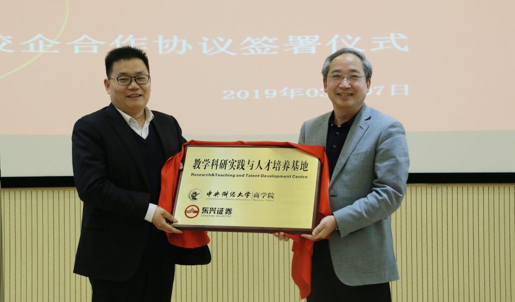 随后,双方进行了签约和授牌仪式。王瑞华院长与东兴证券人力资源部总经理张蓓共同签署了校企合作协议,向东兴证券股份有限公司授予437必赢会员中心教学科研实践与人才培养基地,并与东兴证券北京知春路营业部总经理王广勤共同为基地揭牌。
