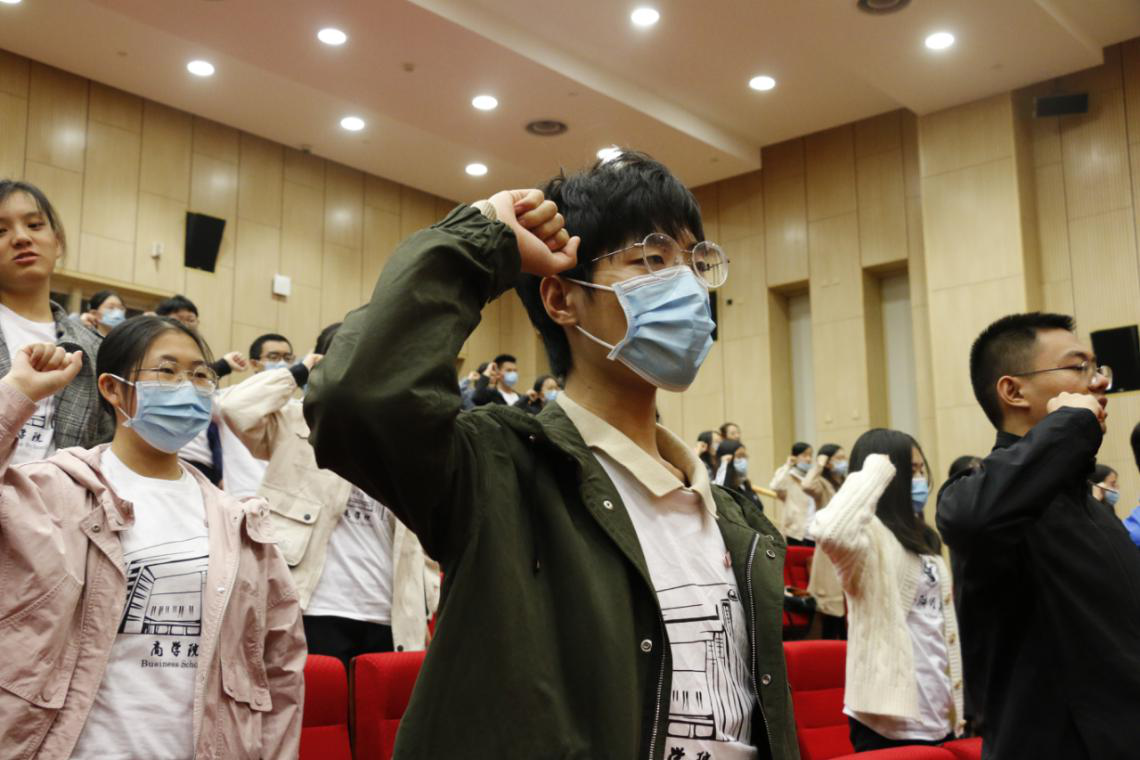 典礼接近尾声,全体新生在四位新生代表的领誓下庄严宣誓。“我,庄严宣誓,热爱祖国,忠于人民;诚信正直,尊师重道;勤奋学习,积极创新;担当责任,追求卓越;以工商管理之学识,成经世济民之英才。”