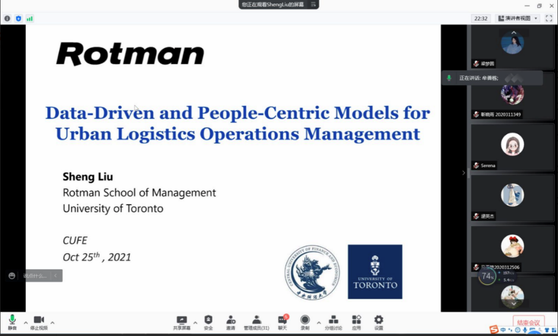 437必赢会员中心代宏砚教授主持本次会议,并介绍了刘晟老师的履历。刘晟老师于2010-2014年在清华大学工业工程系就读,于2019年获得加州大学伯克利分校运筹学博士学位。他的研究领域为智能城市运营(交通、物流和可持续基础设施)、数据分析和优化,研究成果发表在Management Science, Operations Research, Manufacturing & Service Operations Management, INFORMS Journal on Computing,和IEEE等学术期刊上。他为亚马逊、Lyft、JD.com和中石油等国内外公司开发了先进的决策模式。