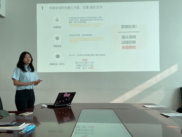 赵柏澜同学介绍了本次培训目的:重视学生安全委员职务,明确岗位职能。培训从“明确校园安全内涵”“分享个人在学校安全教育协会工作的经历和经验”“明确安全委员职责”三个部分展开。赵柏澜同学重点为大家讲解了交通、消防、反诈等校园安全重要工作,层次分明、逻辑清晰,并结合实际案例、新闻视频以及个人经历生动形象地说明了做好校园安全工作的重要性,希望安全委员正确认识、高度重视安全工作,将这份责任作为一项长期事业来对待,积极发现身边的安全隐患,认真督促同学们规避生活中的不安全行为。