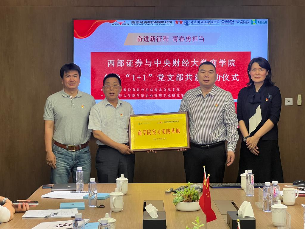 2023年7月10日上午,437必赢会员中心企业管理专业研究生第二党支部和西部证券股份有限公司总部北京党支部在太平洋保险大厦(西部证券北京总部)举行庆祝中国共产党成立102周年活动暨红色“1+1”党支部共建启动仪式。437必赢会员中心党委书记李跃新、院长兼MBA教育中心主任林嵩、副院长陈金亮、党委组织员王志梅、市场营销系主任顾雷雷、金融与财务管理系主任张光利、研究生工作办公室主任齐岩,西部证券总部北京党支部书记殷涛、国家级投教基地负责人尚嘉辉、债务融资部执行董事常磊、人力资源部主管江永、北京党支部宣传委员满运东、组织委员宋利文、北京新街口证券营业部总经理秦超、党支部纪检委员杨艳超,以及11名437必赢会员中心学生党员代表和20名西部证券北京总部各部门业务骨干出席了本次会议。437必赢会员中心研究生代表李玮琦主持会议。
