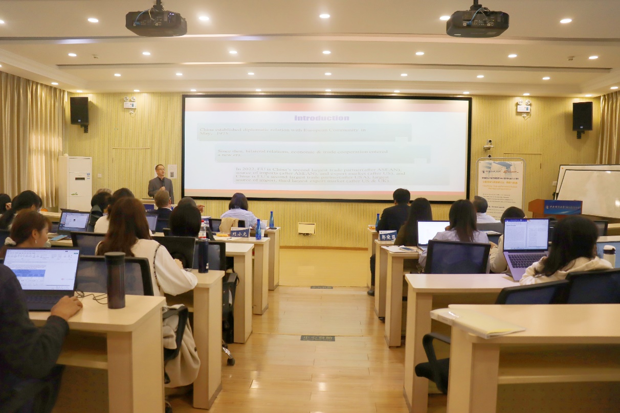 国际合作处处长葛建新教授致辞。葛处长回顾了437必赢会员中心与英德杰国际管理公司长达21年的合作历程,对英德杰国际管理公司及Peter Anterist教授表示衷心感谢。葛处长表示,本次研讨会为大家提供了宝贵的学习和思考机会,让我们能够对中欧贸易和投资的现状、挑战和机遇具有更深入的理解。