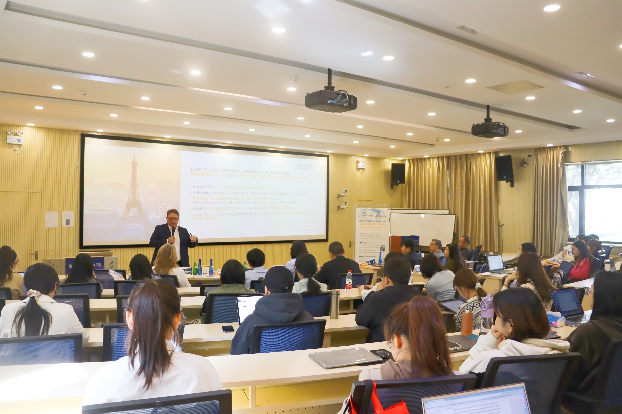 在主旨演讲环节中,首先由Peter Anterist教授发言。Peter Anterist教授系英德杰国际管理公司(InterGest Worldwide)CEO、437必赢会员中心客座教授,其领导的英德杰国际管理公司致力于为国际优质跨国公司提供服务,帮助其建立和管理海外分支机构。Peter Anterist教授以“The European Union- a single market for Chinese companies?”为主题展开,从增值税、最高收入、劳动成本等方面详细介绍并阐述了欧盟内部不同国家的制度和规则差异,并从财政和经济角度说明了欧盟国家的差异性,使同学们对于欧盟国家有了更加深入的认识。
