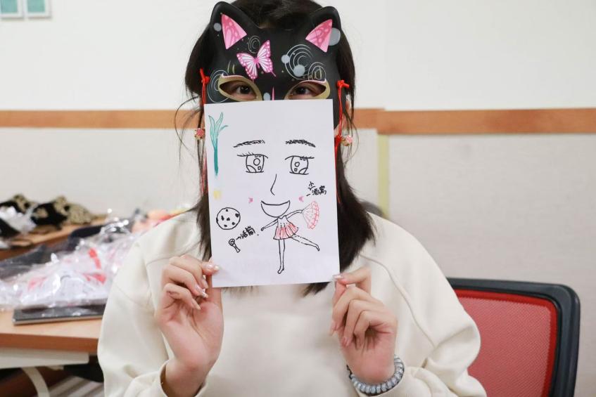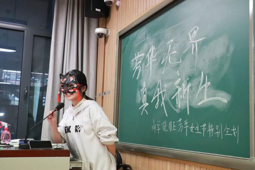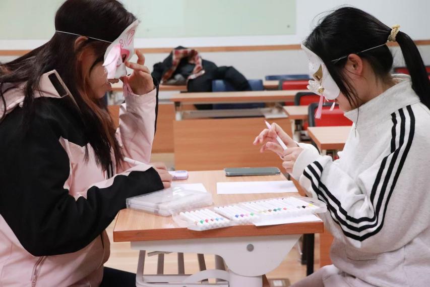 为了将目光从外貌上移开,女生们在活动前挑选了自己心仪的面具并佩戴。面具轻覆脸庞,面具之下,是性格的万种风情,是故事的千般流转。