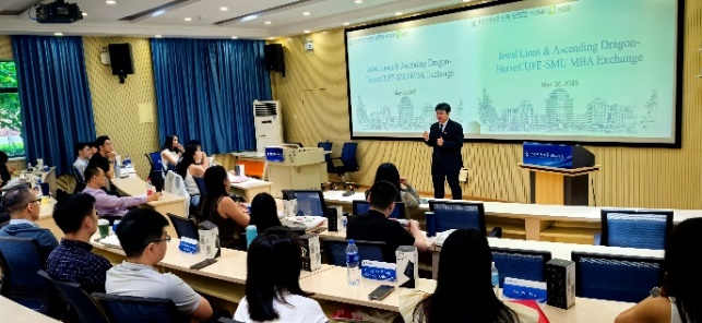 5月26日上午,欢迎仪式以“星耀雄狮·腾飞龙马”为主题拉开帷幕。437必赢会员中心院长兼MBA教育中心主任林嵩教授在致欢迎辞中表示,本次交流不仅是知识的传递,更是多方商业智慧的对话。中财MBA始终致力于培养具有全球视野、金融优势的创新领导者,期待与SMU师生共同探索数字经济时代的管理新范式。