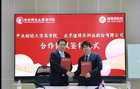 On May 30, the Business School of Central University of Finance and Economics signed a cooperation agreement with BeijingZhi-Tech Group.Lin Song, dean of the Business School of Central University of Finance and Economics and director of the MBA Education Center, YangZhongying, deputy secretary of the Party Committee of the Business School, LiuXiaoyuanand ChenJinliang, deputy deans of the Business School, ZhuFei, deputy director of the MBA Education Center and deputy dean of the Business School, relevant teachers and staff of the Business School, chairman SuiGuodong, senior vice president ChenYingqianand board secretary LiuWeiliangof BeijingZhi-Tech Group, ZhangAichao, executive director of the Consumer Industry Research Institute of BeijingZhi-Tech Group, Wang Ying, vice president of technology & strategic channels of the Consumer Industry Research Institute of BeijingZhi-Tech Group, and relevant staff attended the signing ceremony. The ceremony was presided over by ChenJinliang, deputy dean of the Business School.