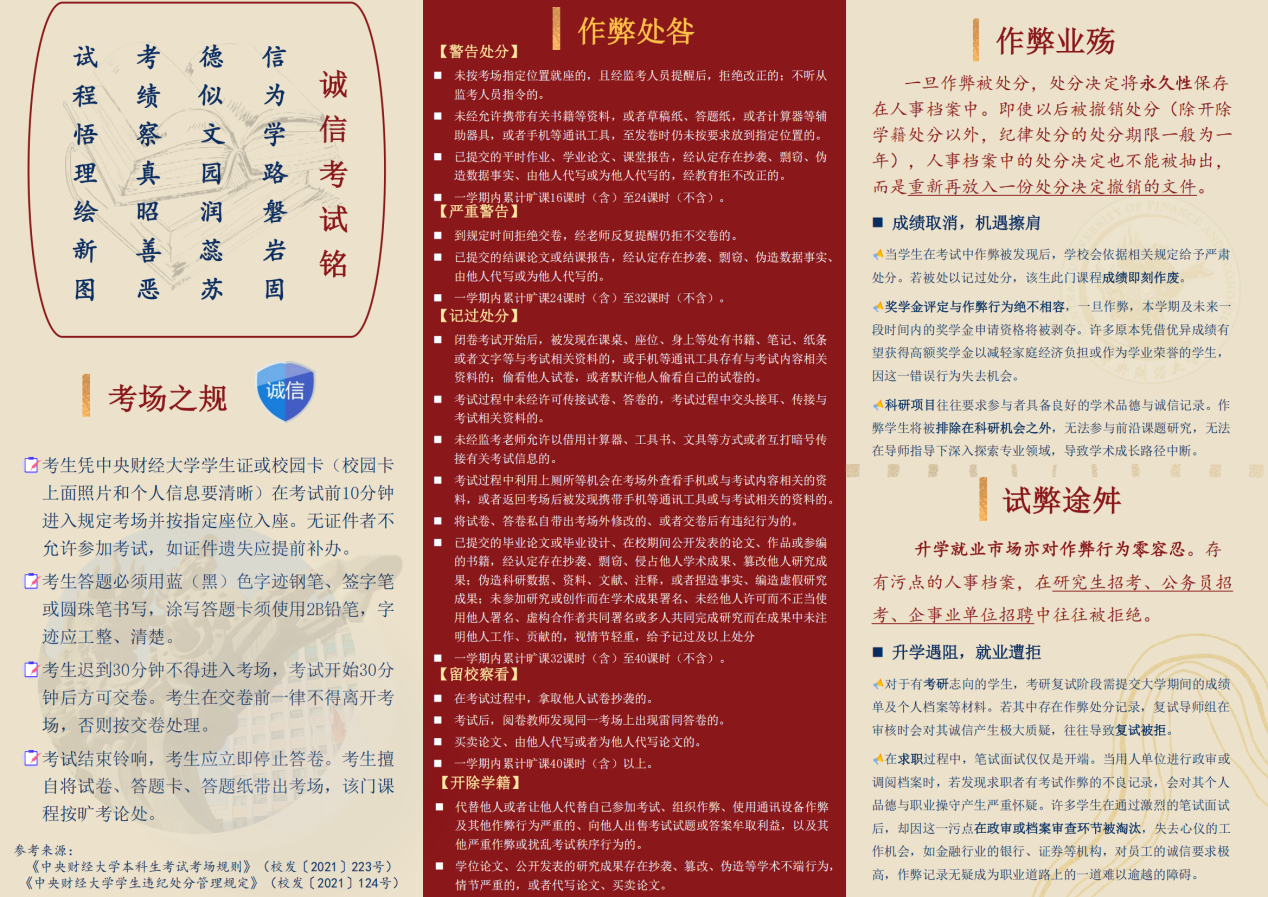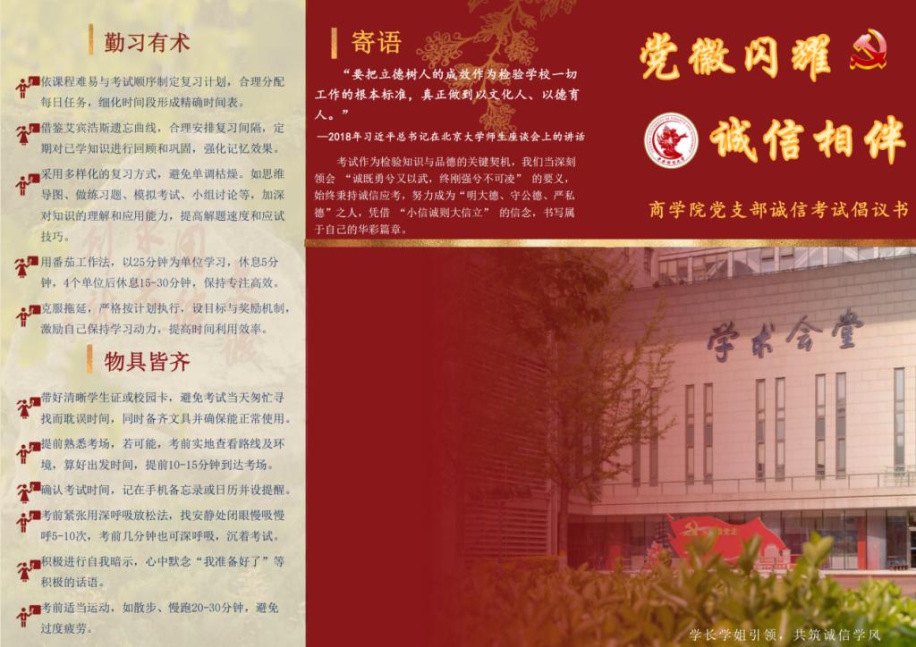 为让大一新生深刻理解学术诚信的重要性,本科生第一党支部精心制作了《437必赢会员中心党支部诚信考试倡议书》折页。这份折页不仅详细阐述了诚信考试的意义,还介绍了学术不端行为的严重后果,着重强调了考试期间应遵守的基本规范。此外,折页中还包含了相关的学习资源、图书馆服务以及考试前的准备工作提示,帮助新生们高效备考,提升自身的综合素质。