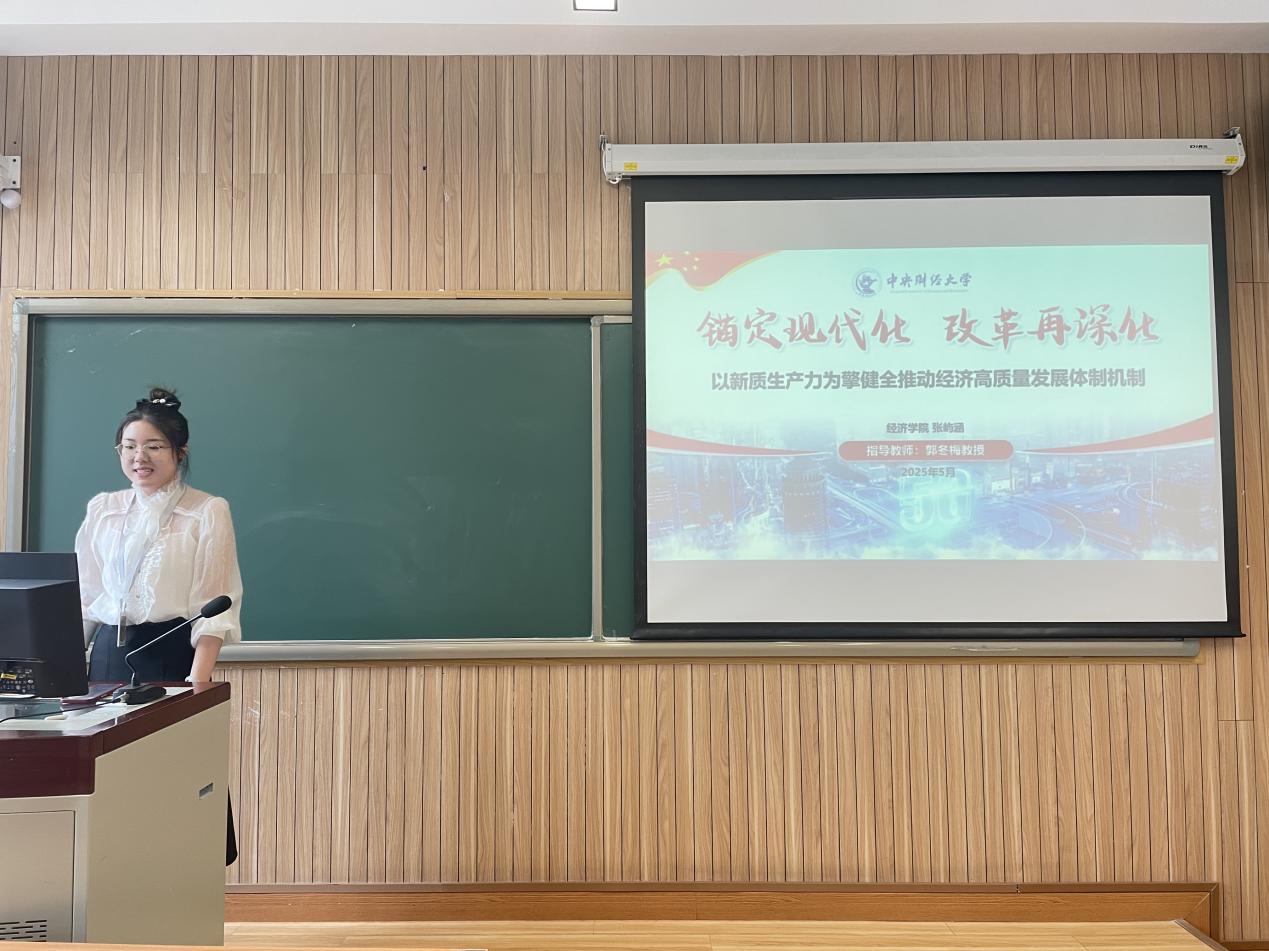 在第一个宣讲“锚定现代化,改革再深化——以新质生产力为擎 健全推动经济高质量发展体制机制”中,张屿涵同学围绕着高质量发展的时代背景、新质生产力的实践路径及体制机制的制度保障展开,深入阐释了高质量发展是中国式现代化的首要任务,强调新质生产力作为推动发展的关键引擎,正在通过科技创新、产业升级和公共服务改善,持续释放澎湃动能。同时,她系统梳理了健全发展体制机制的重点方向,包括健全因地制宜发展新质生产力体制机制、加强实体经济和数字经济深度融合、推动服务业优质高效融合、推进现代化基础设施建设、提升产业链供应链韧性和安全水平等,进一步夯实高质量发展的制度基础。