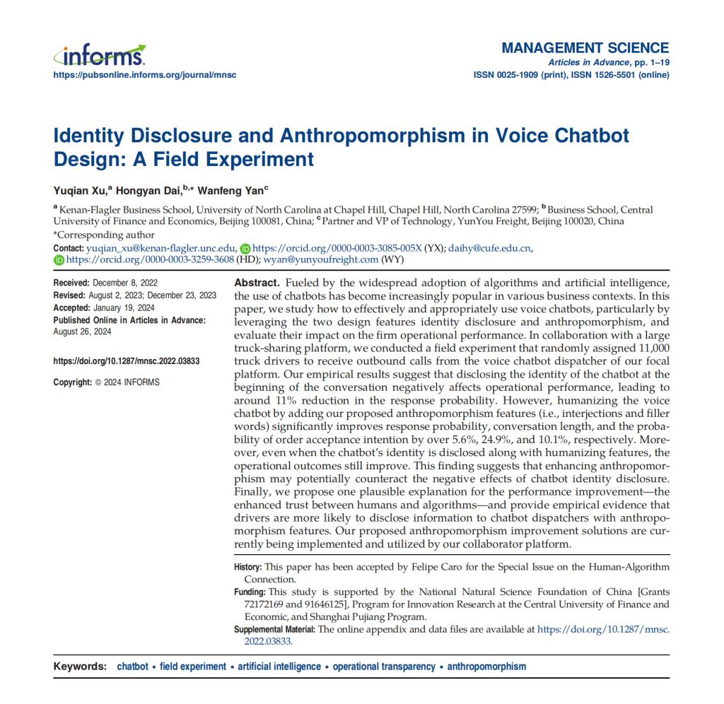 近日,必赢官网代宏砚教授与北卡罗莱纳大学教堂山分校Yuqian Xu教授及云柚货运合伙人兼技术副总裁闫晚丰合作撰写的论文《Identity Disclosure and Anthropomorphism in Voice Chatbot Design: A Field Experiment》在国际顶级学术期刊《Management Science》发表,代宏砚教授为通讯作者。代宏砚教授于2023年在《Management Science》上成功发表论文《The Interplay of Earnings, Ratings, and Penalties on Sharing Platforms: An Empirical Investigation》,研究众包劳动力的行为和激励问题。仅时隔一年,再获佳绩。