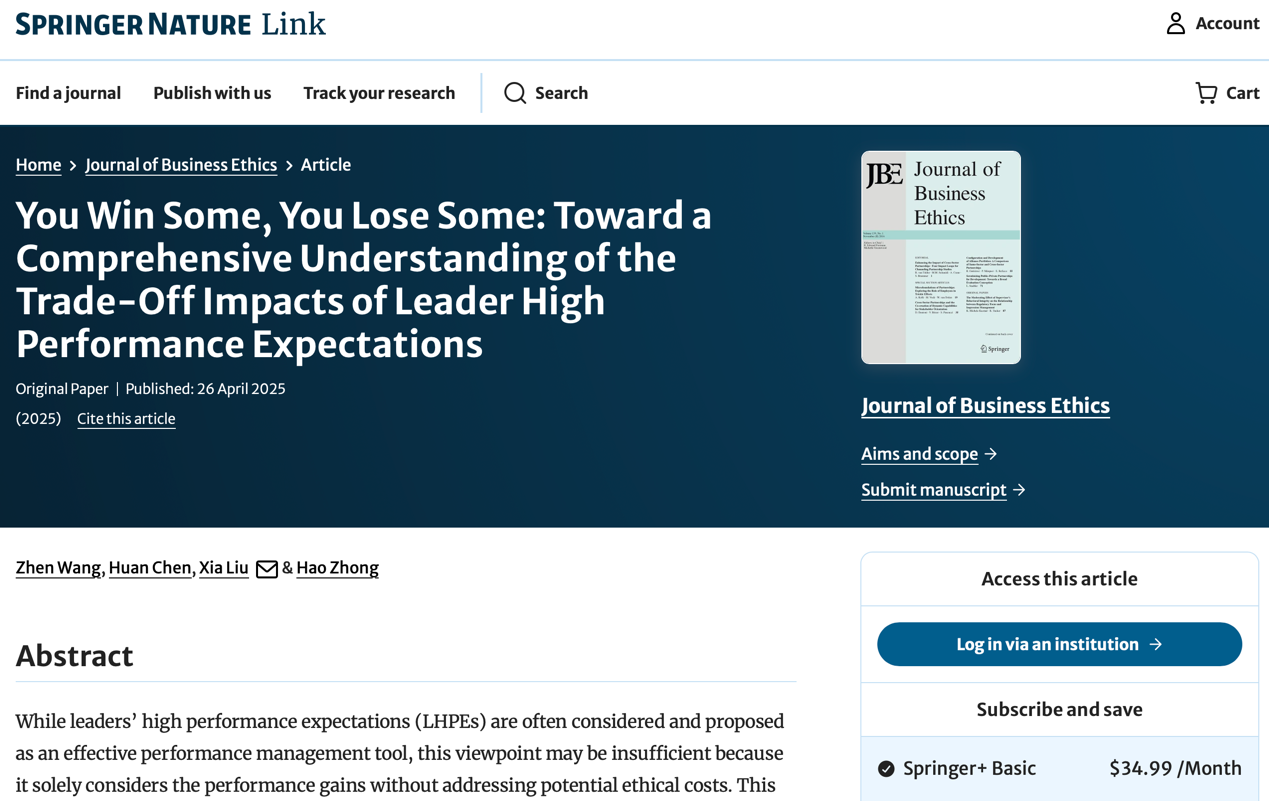 近日,必赢官网王震教授牵头的论文“You Win Some, You Lose Some: Toward a Comprehensive Understanding of the Trade-Off Impacts of Leader High Performance Expectations”被Journal of Business Ethics接受并在线发表。该论文是王震教授以必赢官网教师身份在FT50期刊上发表的第10篇研究成果,此前的成果已发表在 Journal of Applied Psychology(JAP)、Organizational Behavior and Human Decision Processes(OBHDP)、Human Relations(HR)和Human Resource Management(HRM) 等管理学顶级或权威期刊。